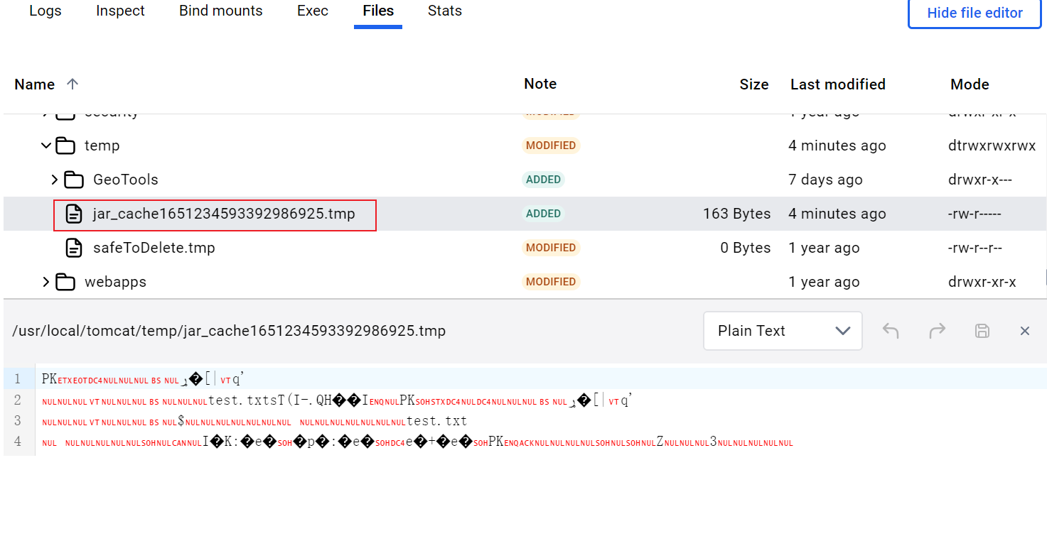 当我们使用jar协议去处理jar包时,会将压缩包缓存到系统中的某个临时文件下,这里的临时文件写入到了/usr/local/tomcat/temp/jar_cache1651234593392986925.tmp中,解压缩后读取我们想要的文件
