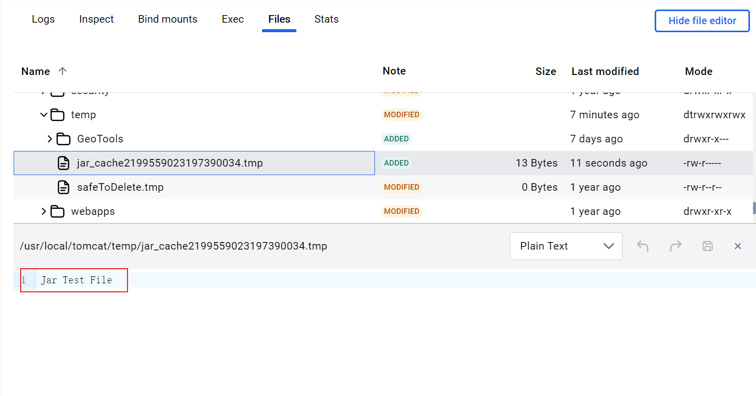 但是这个文件内容并不一定要遵循压缩包的格式,我们将压缩包内容改为Jar Test File,然后再进行Jar协议读取,可以看到也是可以进行临时缓存的