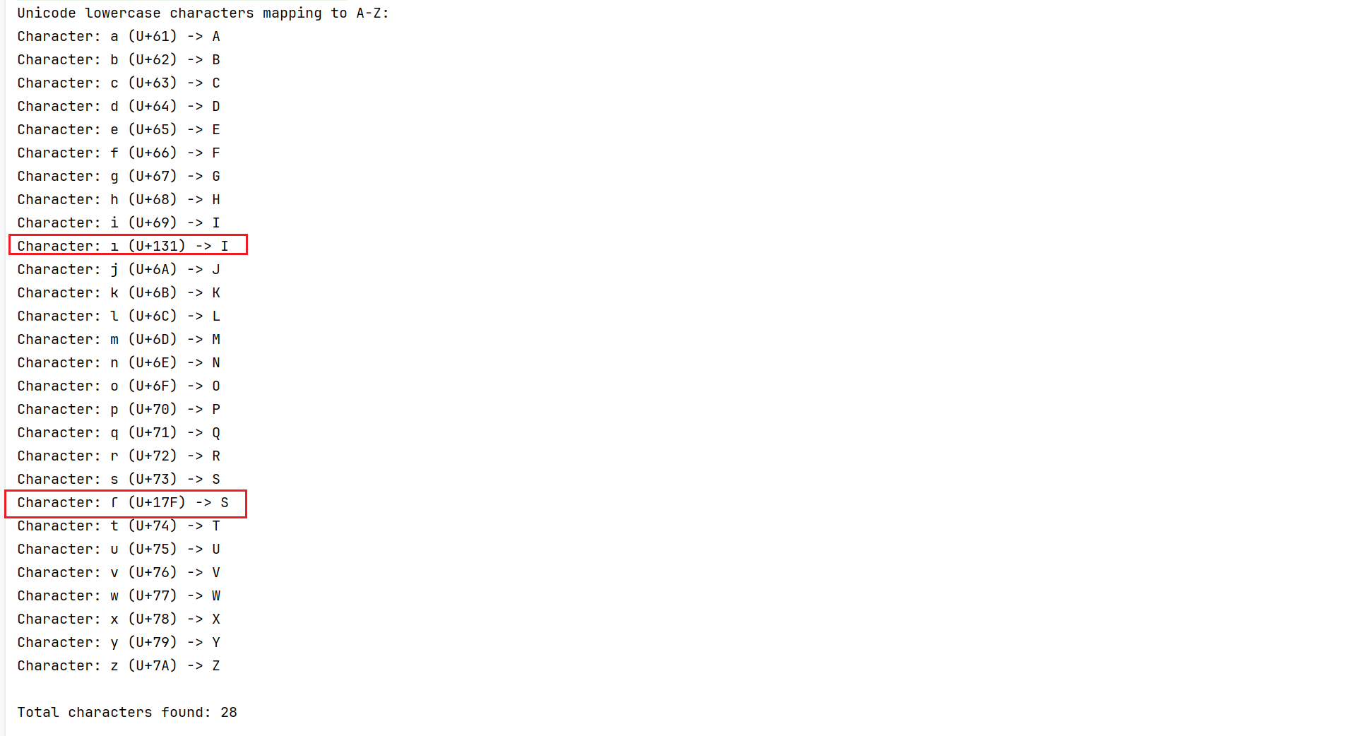 if (lowerCase.equals(String.valueOf(lowerChar)) && !upperChar.equals(lowerCase)) { results.add("Character: " + upperChar + " (U+" + Integer.toHexString(codePoint).toUpperCase() + ") -> " + lowerChar); } } catch (IllegalArgumentException e) { continue; } } }
