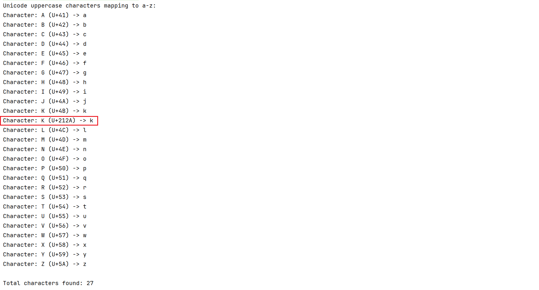 同样toLowerCase也有较为特别的字符,同样写出Fuzz脚本