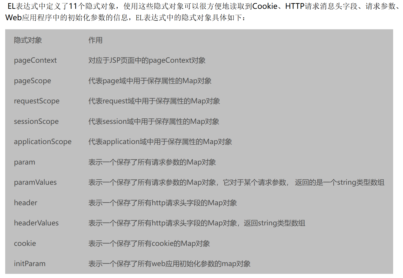 在EL表达式中定义了11个隐式对象,使用这些隐式对象可以很方便地读取到Cookie、HTTP请求消息头字段、请求参数、Web应用程序中的初始化参数的信息
